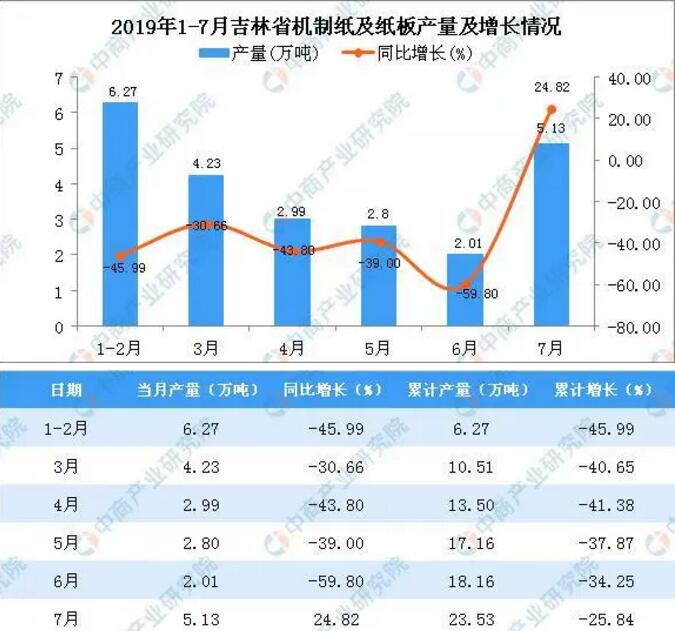 吉林省 2019年1-2季度吉林省機(jī)制紙及紙板產(chǎn)量有所下降,2019年7月吉林省機(jī)制紙及紙板產(chǎn)量為5.13萬噸,同比增長24.82%。2019年1-7月吉林省機(jī)制紙及紙板產(chǎn)量為23.53萬噸,同比下降25.84%。