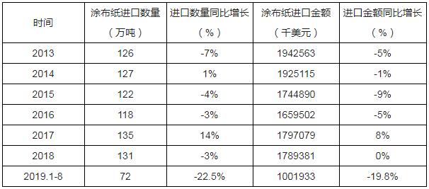 根據(jù)中國(guó)海關(guān)數(shù)據(jù)顯示:2019年1-8月中國(guó)涂布紙進(jìn)口數(shù)量為72萬(wàn)噸,同比下降22.5%;2019年1-8月中國(guó)涂布紙進(jìn)口金額為1001933千美元,同比下降19.8%。