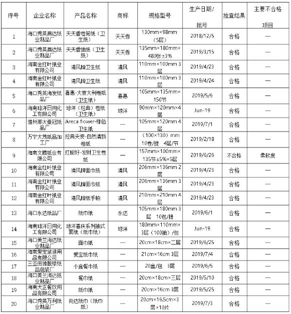 海南省抽檢生活用紙產品20批次 不合格1批次