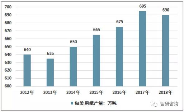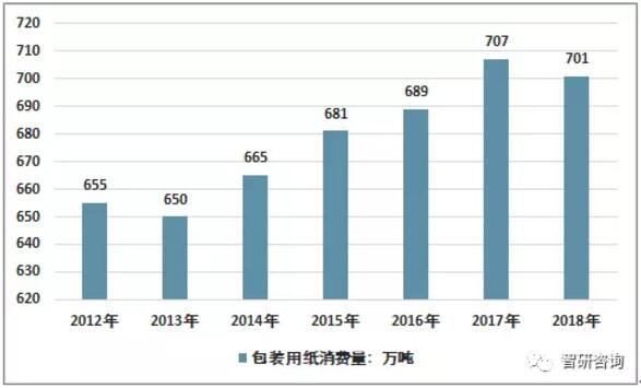 中國包裝用紙主要包括白板紙、箱板紙、瓦楞原紙及其它紙板等,產(chǎn)品涉及人們生產(chǎn)生活各個領(lǐng)域,包括包裝食品、藥品、家用電器、日用百貨、針棉織物、文化用品等,是中國紙及紙板消費量占比最大的紙種之一。 2018年包裝用紙生產(chǎn)量690萬噸,較上年下降0.72%;消費量701萬噸,較上年下降0.85%。2009~2018年生產(chǎn)量年均增長率2.05%,消費量年均增長率1.99%。 2012-2018年中國包裝用紙產(chǎn)量及增長