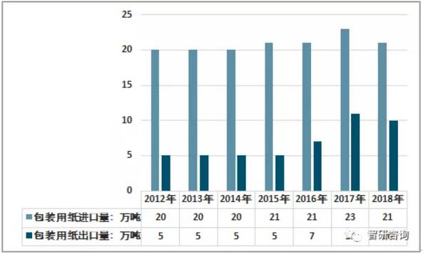 截止到2018年,中國包裝用紙進口量為21萬噸,同比下降8.7%。包裝用紙出口量為10萬噸,同比下降9.1%。 2012-2018年中國包裝用紙進出口情況
