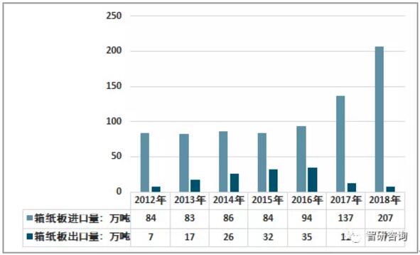 近年來中國網(wǎng)絡(luò)購物快速發(fā)展,產(chǎn)品運輸過程中的二次包裝帶動了箱板紙需求量上升。截止到2018年中國箱板紙進口量為207萬噸,同比增長51.1%。箱板紙出口量為7萬噸,同比下降41.7%。 2012-2018年中國箱板紙進出口情況