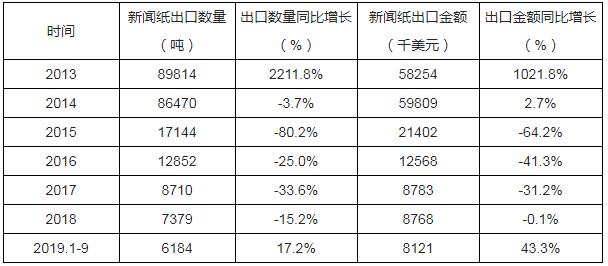 2013-2019年9月中國(guó)新聞紙出口數(shù)量及出口金額統(tǒng)計(jì)表