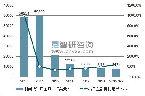 2013-2019年9月中國(guó)新聞紙出口金額趨勢(shì)圖