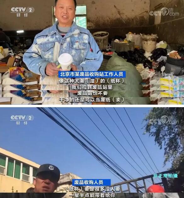 記者去了北京幾處廢品收購站,發(fā)現(xiàn)回收人員對不同紙杯子的回收態(tài)度也不同:濕紙杯,不回收;臟紙杯,不回收;干凈的干紙杯,有回收需求。