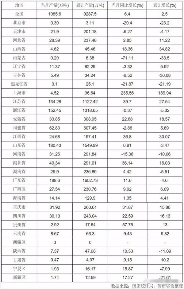 據國家統計局數據顯示,2019年9月份,國內機制紙及紙板產量為1085.6萬噸,同比增長6.4%。而2019年1-9月,國內機制紙及紙板產量為9287.5萬噸,同比增長2.5%。 具體在各省份,廣東省產量最高,1-9月份累計產量為1652.73萬噸,同比增長4.6%;其次為山東省,1-9月份累計產量為1549.99萬噸,同比下降3.47%。位居第三的是浙江省,1-9月份累計產量為1318.65萬噸,同比下降5.32%。 2019年1-9月中國機制紙及紙板產量分省市統計