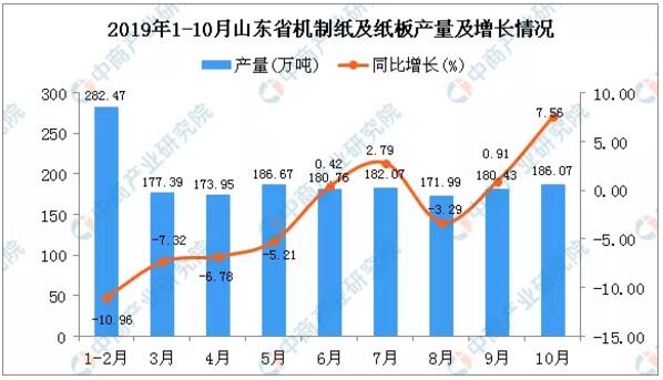 2019年1-10月山東省機制紙及紙板產量及增長情況
