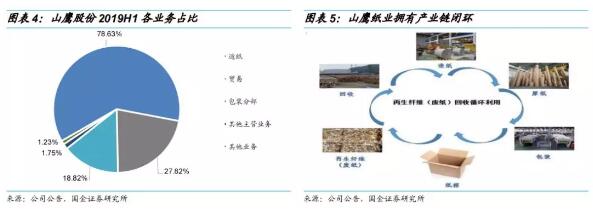 山鷹紙業(yè)是目前國內(nèi)僅有的一家集再生纖維回收、造紙、包裝、印刷、貿(mào)易、物流、投融資等為一體的國際化紙業(yè)集團(tuán),造紙及包裝印刷規(guī)模均位居全國前列。其箱板紙產(chǎn)能和市占率穩(wěn)居均位居行業(yè)前三,同時在海外積極布局,已擁有9家造紙企業(yè)和23家包裝印刷設(shè)計(jì)及生產(chǎn)企業(yè)。公司2017年下半年收購了北歐紙業(yè),于2018年分別收購了歐洲的WPT和北美的鳳凰紙業(yè)。2018年,北歐紙業(yè)實(shí)現(xiàn)凈利潤2.45億元人民幣。2018年8月至12月,WPT實(shí)現(xiàn)凈利潤1082萬元人民幣。北美鳳凰紙業(yè)已于2019年5月底開始生產(chǎn)。 公司產(chǎn)業(yè)上端有國內(nèi)外廢紙收購網(wǎng)絡(luò),產(chǎn)業(yè)下端在全國各地布局紙箱廠,這種產(chǎn)業(yè)布局可以使公司及時、準(zhǔn)確、全面地掌握廢紙和原紙的市場價格信息,有利于公司適時調(diào)整原材料和產(chǎn)品的定價策略,從而控制生產(chǎn)成本。受益于產(chǎn)業(yè)鏈協(xié)同效益,公司的包裝產(chǎn)業(yè)也將成為新一輪的利潤增長點(diǎn),逐漸成為與造紙產(chǎn)業(yè)并重、支撐公司戰(zhàn)略的驅(qū)動力。 公司投資新建的華中造紙基地,預(yù)計(jì)2019年一、二期項(xiàng)目完工后年產(chǎn)能可達(dá)127萬噸,屆時公司年規(guī)劃產(chǎn)能規(guī)模將接近600萬噸,有望進(jìn)一步降低成本,公司在積極擴(kuò)張產(chǎn)能,強(qiáng)化規(guī)模優(yōu)勢。 公司主營業(yè)務(wù)為箱板紙、瓦楞原紙、特種紙、紙板及紙箱的生產(chǎn)和銷售以及國內(nèi)外再生纖維貿(mào)易業(yè)務(wù),主要產(chǎn)品為“山鷹牌”各類包裝原紙、新聞紙及紙板、紙箱、“Nordic Paper”特種紙等紙制品。截止2019年三季度,公司實(shí)現(xiàn)原紙產(chǎn)量352.19萬噸,銷量348.43萬噸,產(chǎn)銷率98.93%;瓦楞箱板紙箱產(chǎn)量9.18億平方米,銷量9.42億平方米,產(chǎn)銷率02.61%。公司包裝紙產(chǎn)銷量位居中國第三,占中國市場份額為9%,在中國的華東市場占據(jù)25%份額,排名第一。公司包裝板塊銷量位居中國第二,整體市場份額為1.6%。