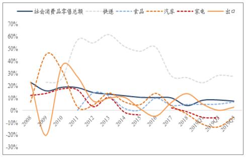 瓦楞紙板是一個多層的黏合體,最少由一層波浪形芯紙夾層及一層紙板構成。它有很高的機械強度,能抵受搬運過程中的碰撞和摔跌。瓦楞紙箱的實際表現取決于三項因素:芯紙和紙板的特性及紙箱本身的結構。 箱板瓦楞紙下游的需求以家電、食品、汽車、快遞等社零和出口需求為主,相對具有韌性。復盤歷史需求演變,一方面社零增速自2018年有較為明顯的下滑,2019年Q1、Q2已經出現企穩;一方面外需出口由于中美貿易戰的影響2018年同比出現較大幅度下滑,2019年Q2、Q3隨中美貿易關系的緩和略有上升。箱板瓦楞紙行業下游需求已經出現邊際出現企穩。 包裝紙下游內外需變化