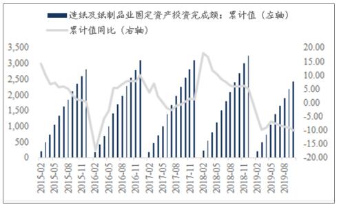 圖表來源:東吳證券研究所 固定投資持續走低,反應新增產能預期。此外造紙固定資產投資完成額自2018年初見頂后持續走低,反饋行業中小企業盈利壓縮的大背景下投產動力不足,市場有效供給較為有限。 固定資產投資