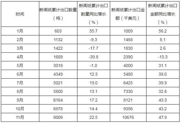 根據中國海關數據顯示:2019年1-11月中國新聞紙 出口數量為8009噸,同比增長22.5%;2019年1-11月中國新聞紙 出口金額為10676千美元,同比增長47.9%。