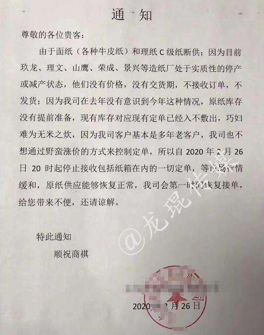 2月26日,浙江省某企業(yè)發(fā)布了一份特殊的停單通知。之所以說它特殊,是因?yàn)橥ㄖ鞔_指出了行業(yè)存在的問題:原紙斷供、庫存低位、漲幅過大……為此,該企業(yè)決定停止接受一切訂單,等市場行情緩和,原紙供應(yīng)恢復(fù)正常時(shí)再接單。 通知內(nèi)容如下: 因?yàn)槊婕垼ǜ鞣N牛皮紙)和里紙C級紙斷供;因?yàn)槟壳熬笼垺⒗砦摹⑸晋棥s成、景興處于實(shí)質(zhì)性的停產(chǎn)或減產(chǎn)狀態(tài),他們沒有價(jià)格,沒有交貨期,不接收訂單,不發(fā)貨;因?yàn)槲宜驹谌ツ隂]有意識到今年這種情況,原紙庫存沒有提前準(zhǔn)備,現(xiàn)有庫存對應(yīng)現(xiàn)有訂單已經(jīng)入不敷出,巧婦難為無米之炊;因?yàn)槲宜究蛻艋旧鲜嵌嗄昀峡蛻簦宜疽膊幌胪ㄟ^野蠻漲價(jià)的方式控制訂單。 所以自2020年2月26日20時(shí)起,停止接收包括紙箱在內(nèi)的一切訂單,等市場行情緩和,原紙供應(yīng)能夠恢復(fù)正常時(shí),我司會第一時(shí)間恢復(fù)接單。給您帶來的不便,還請諒解!