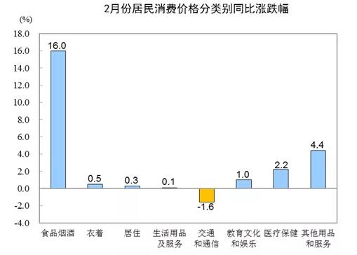 一、各類商品及服務價格同比變動情況 2月份,食品煙酒類價格同比上漲16.0%,影響CPI(居民消費價格指數)上漲約4.84個百分點。 食品中,畜肉類價格上漲87.6%,影響CPI上漲約3.85個百分點,其中豬肉價格上漲135.2%,影響CPI上漲約3.19個百分點;鮮菜價格上漲10.9%,影響CPI上漲約0.33個百分點;水產品價格上漲2.8%,影響CPI上漲約0.05個百分點;蛋類價格上漲1.0%,影響CPI上漲約0.01個百分點;糧食價格上漲0.7%,影響CPI上漲約0.01個百分點;鮮果價格下降5.6%,影響CPI下降約0.11個百分點。 其他七大類價格同比六漲一降。其中,其他用品和服務、醫療保健、教育文化和娛樂價格分別上漲4.4%、2.2%和1.0%,衣著、居住、生活用品及服務價格分別上漲0.5%、0.3%和0.1%;交通和通信價格下降1.6%。