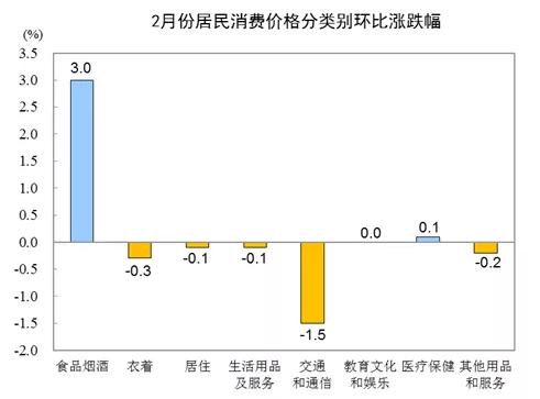 二、各類商品及服務價格環比變動情況 2月份,食品煙酒類價格環比上漲3.0%,影響CPI上漲約0.99個百分點。 食品中,鮮菜價格上漲9.5%,影響CPI上漲約0.28個百分點;畜肉類價格上漲7.1%,影響CPI上漲約0.53個百分點,其中豬肉價格上漲9.3%,影響CPI上漲約0.45個百分點;鮮果價格上漲4.8%,影響CPI上漲約0.08個百分點;水產品價格上漲3.0%,影響CPI上漲約0.05個百分點;蛋類價格下降5.8%,影響CPI下降約0.04個百分點。 其他七大類價格環比一漲一平五降。其中,醫療保健價格上漲0.1%;教育文化和娛樂價格持平;交通和通信、衣著、其他用品和服務價格分別下降1.5%、0.3%和0.2%,居住、生活用品及服務價格均下降0.1%。
