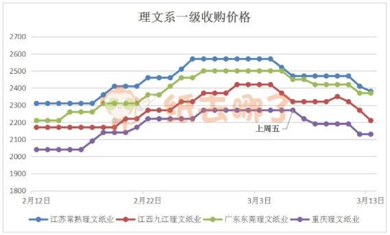 上周山鷹系A級廢紙收購價格走勢波瀾起伏,整體下跌。浙江、安徽山鷹“跌-漲-跌”,湖北山鷹先跌后漲,福建山鷹降價兩次。 截至3月13日上午,浙江、福建、湖北山鷹總體分別下調70、60、10元/噸,安徽雖多次起伏,但最終持平在與前一周周五相同的2350元/噸。 山鷹系A級價格以浙江、安徽山鷹最高,為2350元/噸;湖北山鷹最低,為2170元/噸。 03、理文系一級收購價格走勢