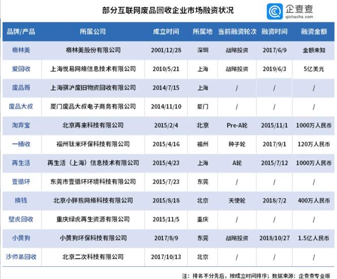 廢品回收行業向來都會被貼上“臟亂差”的標簽,不過與這些標簽不匹配的是,廢品回收行業市場規模過萬億,發展前景不可小覷。 令人不解的是,規模如此可觀的廢品回收行業為何至今仍混亂無序?原因主要有兩個: 首先,廢品回收產業鏈是“頭輕腳重”的金字塔型模型。處于金字塔最底端的廢品處理和再生企業居多,而專干臟活累活的上游回收環節卻由大量散戶及小型回收站掌控,這就造成了廢品回收行業不規范、監管難的局面。 其次,相比于歐美市場60%的回收利用率,國內目前尚未達到25%,這也就意味著,廢品回收產業尚處在“散兵游勇”階段,具有明顯的小、散、差等特點,粗放式經營更是大大減弱了傳統廢品回收企業和從業人員抵御風險的能力。 但這并不能阻礙創業者利用互聯網工具對廢品回收行業進行改造。 相比傳統模式,“互聯網+廢品回收”有不少優勢,比如互聯網廢品回收平臺可以打破信息孤島,能夠鏈接起全產業的各個環節,是對傳統廢品回收行業的升級和轉型。 根據“某企業信息查詢平臺”專業版數據查詢到的12家互聯網廢品回收企業中,其中有1家為上市公司,7家披露了市場融資狀況。但從融資次數和融資金額上看,互聯網廢品回收企業似乎并沒有受到資本方的青睞。