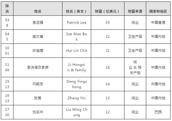 中國內(nèi)地和香港的造紙企業(yè)中共有7人(家族)入選,理文造紙創(chuàng)始人李運(yùn)強(qiáng)以35億美元位列第一,恒安集團(tuán)施文博和許連捷分列第二和第三位,太陽紙業(yè)李洪信及家族第四,中順潔柔董事長鄧穎忠排名第五。玖龍紙業(yè)也有兩人入選,董事長張茵排名第六位,行政總裁劉明中排名第七位,只不過兩人分屬中國內(nèi)地和巴西。