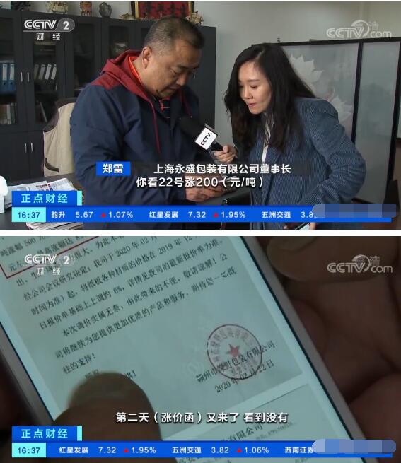上海奉其奉包裝印刷科技有限公司董事長徐龍平:漲上來的時候,我們拿的紙全用到我們用戶那里去了。用戶有一個周轉期漲價,然而到用戶允許漲價的時候,可是市場已經跌了。所以這個時候,用戶會提出不漲價,導致我們買進的原紙和銷售出去的價格是倒掛的。 上海永盛包裝有限公司董事長鄭雷:你長期的話,哪怕再虧也好,價格沒有確定之前,你都要保證供貨,保證為客戶服務。