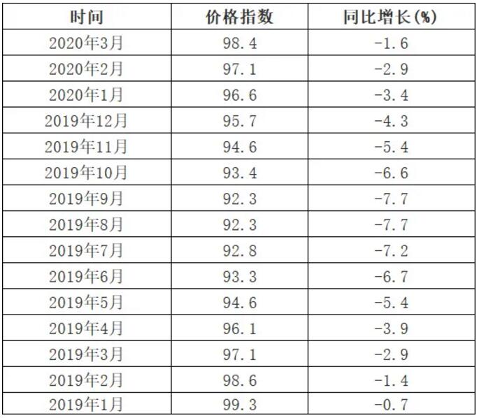 2019年1月-2020年3月造紙和紙制品出廠價格指數統計