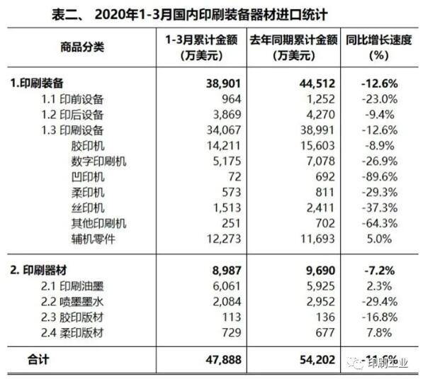 國內(nèi)印刷裝備、器材進口概況 2020年1月—3月,國內(nèi)印刷裝備進口3.89億美元,與去年同期相比,下降12.6%。其中,印前設備進口964萬美元,同比下降23.0%;印刷設備進口3.41億美元,同比下降12.6%;印后設備進口3869萬美元,同比下降9.4%。 從印刷設備子項的進口數(shù)據(jù)看,膠印機進口1.42億美元,同比下降8.9%;數(shù)字印刷機進口5175萬美元,同比下降26.9%;凹印機進口72萬美元,同比下降89.6%;柔印機進口573萬美元,同比下降29.3%;絲印機進口1513萬美元,同比下降37.3%;其他印刷機進口251萬美元,同比下降64.3%;輔機零件進口1.23億美元,同比增長5.0%。 2020年1月—3月,國內(nèi)印刷器材進口8987萬美元,同比下降7.2%。其中,印刷油墨進口2554噸,6061萬美元(同比增長2.3%);噴墨墨水進口1112噸,2084萬美元(同比下降29.4%);膠印版材進口4.60萬平方米,113萬美元(同比下降16.8%);柔印版材進口12.40萬平方米,729萬美元(同比增長7.8%)。