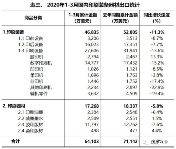 本期國內(nèi)印刷裝備、器材進出口數(shù)據(jù)觀察 從3月開始,各地(除湖北外)印刷企業(yè)和裝備器材制造企業(yè)已經(jīng)陸續(xù)復工復產(chǎn)。但由于境外疫情的擴散,海外訂單能否履行的不確定性陡增。員工短缺、訂單不確定、供應鏈斷檔、現(xiàn)金流緊張等是印刷企業(yè)、裝備器材制造企業(yè)普遍面臨的運營壓力。本期印刷裝備、器材進出口數(shù)據(jù)繼續(xù)呈現(xiàn)雙下降,就是企業(yè)當前運營狀態(tài)的反映。 與去年同期相比,1月—3月國內(nèi)印刷裝備、器材進口下降11.6%,出口下降9.9%。其中,進口方面處于增長的有3個子項(輔機零件、印刷油墨、柔印版材),下降的有10個子項,下降幅度前三的是,凹印機(-89.6%)、其他印刷機(-64.3%)、柔印機(-29.3%);出口方面有3個子項(膠印機、噴墨墨水、柔印版材)處于增長狀態(tài),剩余的10個子項均處于下降狀態(tài)。下降幅度最大的前3個子項是,其他印刷機(-22.9%)、輔機零件(-19.4%)、絲印機(-17.4%)。本期國內(nèi)印刷裝備、器材進出口保持順差,但差額幅度收窄(-4.3%)。 與1月—2月數(shù)據(jù)相比,本期國內(nèi)印刷裝備、器材進出口下降的幅度均有所收窄。這是否預示著國內(nèi)裝備、器材進出口下降的局面開始有所改善,還有待觀察!