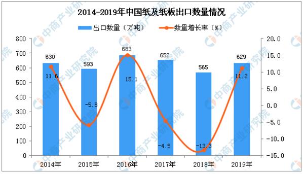 導語:春節后,瓦楞及箱板紙企業復工時間雖然有所推遲,但受原材料廢紙供應短缺的影響,自2月中旬開始紙價呈現逐步上漲走勢。經過3月份的暴漲之后,4月又開始跌價。 1、2019年中國紙及紙板出口量為629萬噸,同比增長11.2% 根據中商產業研究院數據庫顯示,2016-2018年中國紙及紙板出口量有所下降,2019年中國紙及紙板出口量回升;2019年1-12月中國紙及紙板出口量為629萬噸,同比增長11.2%。
