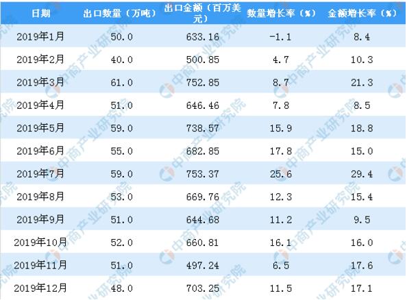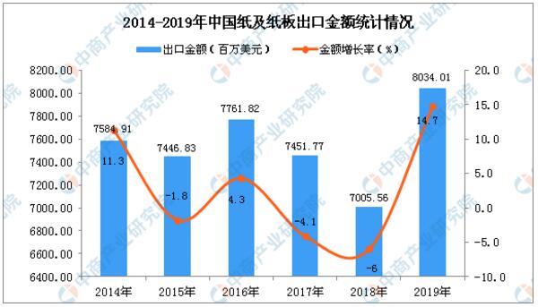 數據來源:中商產業研究院數據庫 從金額方面來看,2019年1-12月中國紙及紙板出口金額為8034.01百萬美元,同比增長14.7%。
