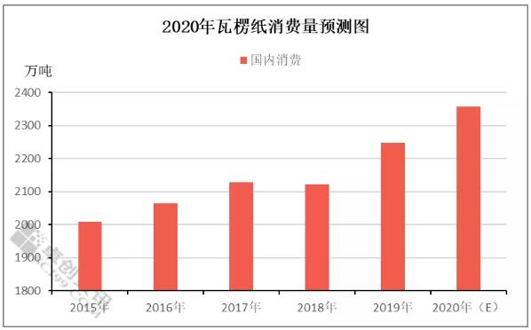 2020年下游各行業發展前景表現不一。紙箱的需求量與下游各行業的發展前景呈現出較高的正相關性。預計2020年瓦楞紙實際消費量約在2358萬噸,同比增速增加4.96%。