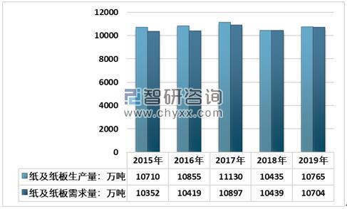 2019年全國紙及紙板生產量10765萬噸,相比2018年的10435萬噸,增長3.16%。消費量10704萬噸,同比增長2.54%。 2015-2019年中國紙及紙板生產和消費情況