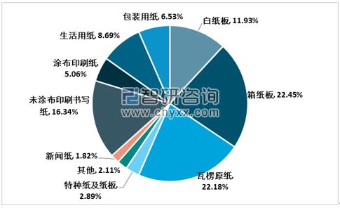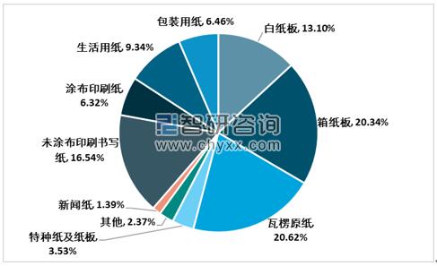 2019年國內紙及紙張細分產品生產有3個品種產量有所下降,整體保持良好的增長趨勢,其中瓦楞原紙、箱紙板、未涂布印刷書寫紙以及白板紙占據主要生產地位,其份額分別為20.62%、20.34%、16.54%以及13.1%。 2019年紙及紙板各品種生產量占總產量的比例