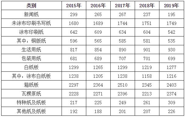 銅版紙消費量535萬噸,較上年下降7.92%;涂布印刷紙消費量542萬噸,較上年下降10.26%;未涂布印刷書寫紙消費量1749萬噸,較上年下降0.11%;新聞紙消費量195萬噸,較上年下降17.72%;生活用紙消費量930萬噸,較上年增長3.22%;包裝用紙消費量699萬噸,較上年下降0.29%;白紙板消費量1277萬噸,較上年增長4.76%;其中,涂布白紙板消費量1216萬噸,較上年增長5.01%;箱紙板消費量2403萬噸,較上年增長2.47%;瓦楞原紙消費量2374萬噸,較上年增長7.28%;特種紙及紙板消費量309萬噸,較上年增長18.39%。 2015-2019年中國紙及紙張細分產品消費情況單位:萬噸