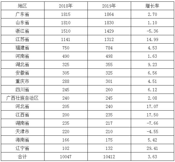 2019年廣東、山東、浙江、江蘇、福建、河南、湖北、安徽、重慶、四川、廣西、河北、江西、湖南、天津、海南和遼寧17個省(區、市)紙及紙板產量超過100萬噸,產量合計10412萬噸,占全國紙及紙板總產量的96.72%。 2019年紙及紙板產量100萬噸以上的省(區、市)單位:萬噸