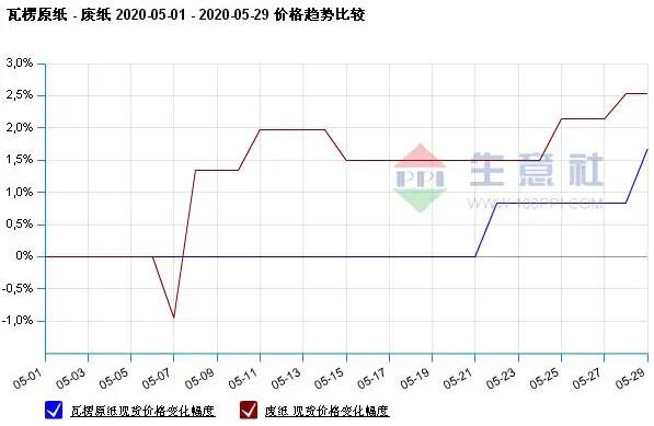 5月初,受勞動節假期期間物流停運及打包站工人休息等因素影響,節后多地區打包站發貨積極,紙廠廢紙到貨量偏多,因而節后(5月7日)多紙廠對廢紙收購價格作出本月首次下調試探,大廠帶動之下,中小廠也紛紛跟降,節前5月1日數據監測顯示A級廢紙收購價格為1804元/噸,節后5月7日數據監測顯示A級廢紙收購價格為1787元/噸,勞動節前后短短7日時間,均價下調17元/噸,降幅近1%。 5月8日,多紙企心態回穩,也為提振業者信心,龍頭企業先行發起廢紙收購漲價通知,接連幾日,中小紙企紛紛跟漲。 5月11日,數據監測顯示A級廢紙收購價格均價已漲至1840元/噸,與5月7日相比,上漲53元,漲幅已近3%。隨后的幾日里,市場整體已平穩運行為主,期間不乏小廠出現小幅調價,但對市場整體影響不大。 至5月14日,全國多地區廢紙市場下調廢紙收購價格,因各地區紙廠到貨量不一,華東地區及各地規模紙廠普遍到貨量偏多,因此市場總體仍處相對弱勢,此輪降價也以華東地區下調最為明顯,34家紙企中有33家下調20-60元/噸不等,其中包括常熟理文、徐州建平、徐州大恒、安徽鑫光、蕭縣林平、金鳳凰、龍源、強偉、柏鄉寶石等紙廠下調20-50。 5月下旬,廢紙市場整體偏弱走勢,下游需求較弱,價格總體低位震蕩,波動不大,部分打包站庫存緩慢增加,成品需求未有明顯回暖,直至5月21日,華東地區大部分紙企率先調漲廢紙收購價格,其中福建地區以華南山鷹為首,漳州港興(老廠)、漳州盈晟、漳州三星、漳州聯盛、漳州華發上調20-70不等,安徽地區滁州兆隆、宿州鑫光、蕭縣林平均上調30,江浙一帶平湖榮晟上調50,徐州建平上調20-30,無錫榮成上調45,常州金湟上調50-80,華南以及華北地區運行較為平穩,僅東莞金田、山西強偉上調30,其他紙廠暫無波動。 接下來幾日,受華東地區規模紙廠上漲的影響,國廢整體維持穩中向好的態勢,市場也在月末幾日出現更為明顯的漲勢。 截止5月29日,廢紙市場A級收購均價為1850元/噸,與月初(5月1日市場收購均價1804.29元/噸)均價上調46元/噸,上漲2.53%。 瓦楞紙市場行情分析 5月,瓦楞紙市場整體呈現穩步上漲態勢,月初,瓦楞紙市場暫穩運行為主,各地區龍頭企業報價暫未調整,中小企業觀望為主,別個小企業勞動節后零散上調瓦楞紙報價50元/噸左右。受節后廢紙市場上漲帶動,加之節前下游補貨較少,節后瓦楞紙需求訂單增多,紙廠也希望維護廢紙漲勢,能夠更好的支撐包裝紙等紙品銷量。