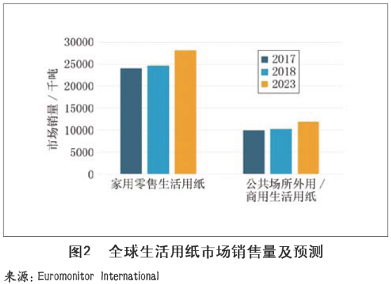 全球生活用紙市場(chǎng)規(guī)模 全球生活用紙行業(yè)市值約790億美元(2018年),包括家用零售生活用紙(AT,At-hometissue)和公共場(chǎng)所用/商用生活用紙(AFH,Away-from-hometissue)。 如圖1和圖2所示,全球生活用紙行業(yè)市值和銷(xiāo)量都呈平穩(wěn)增長(zhǎng)態(tài)勢(shì),無(wú)論是家用零售還是商用生活用紙市場(chǎng)都比較樂(lè)觀(guān)。生活用紙行業(yè)的增長(zhǎng)與全球平均生活水平的提高和生活條件的改善息息相關(guān),雖然發(fā)達(dá)國(guó)家市場(chǎng)已經(jīng)基本飽和,增長(zhǎng)潛力不大,但新興市場(chǎng)的崛起不斷為行業(yè)需求注入新的生機(jī),電子商務(wù)、直面消費(fèi)者的DTC模式等多元銷(xiāo)售模式的出現(xiàn)也刺激了生活用紙行業(yè)的發(fā)展。