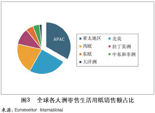 全球各地區(qū)生活用紙發(fā)展水平不均衡 如圖3所示,由于經(jīng)濟(jì)發(fā)展水平和生活習(xí)慣等差異,全球各大洲家用零售生活用紙市場(chǎng)發(fā)展水平各不相同,其中由于人口優(yōu)勢(shì)以及新興市場(chǎng)較多,亞太地區(qū)零售生活用紙銷(xiāo)售額占全球總額的33%,其次是北美、西歐、拉丁美洲、東歐、中東和非洲、大洋洲。其中西歐和北美市場(chǎng)發(fā)展較為成熟,開(kāi)發(fā)潛力相對(duì)較小,而亞太地區(qū)尤其是東南亞,以及非洲的市場(chǎng)發(fā)展?jié)摿ψ畲蟆?/p>