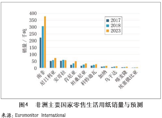 亞太地區(qū)生活用紙市場(chǎng)規(guī)模巨大,其中東南亞是增長(zhǎng)最快的市場(chǎng),由于新興國(guó)家較多,中產(chǎn)階級(jí)日漸龐大,未來(lái)市場(chǎng)仍有很大的增長(zhǎng)潛力。亞太地區(qū)生活用紙領(lǐng)域具有以下發(fā)展趨勢(shì): 第一,隨著中產(chǎn)階級(jí)日漸龐大,各生活用紙品牌持續(xù)創(chuàng)新,希望通過(guò)更高質(zhì)量的產(chǎn)品吸引中高收入群體。 第二,消費(fèi)者越來(lái)越關(guān)注環(huán)境和氣候變化,傾向于使用環(huán)保型產(chǎn)品,各生產(chǎn)商不斷推出環(huán)保型生活用紙。第三方安全認(rèn)證是重要的購(gòu)買(mǎi)標(biāo)準(zhǔn),可以確保產(chǎn)品的安全問(wèn)題,很多消費(fèi)者表示愿意花更多的錢(qián)購(gòu)買(mǎi)安全放心的產(chǎn)品。 第三,亞太地區(qū)生活用紙企業(yè)不斷擴(kuò)充纖維種類(lèi),采用更多可持續(xù)的纖維,例如竹子和秸稈等。 非洲生活用紙市場(chǎng)發(fā)展水平整體偏低,但是增長(zhǎng)較快。如圖4所示,作為發(fā)展水平較高的國(guó)家,南非零售生活用紙銷(xiāo)量明顯高于其他非洲國(guó)家,其次為尼日利亞、安哥拉、肯尼亞、坦桑尼亞、科特迪瓦、加納、烏干達(dá)、喀麥隆、埃塞俄比亞等。