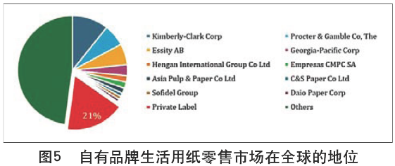 非洲生活用紙領(lǐng)域具有以下發(fā)展趨勢(shì): 第一,行業(yè)市場(chǎng)潛力大,除安哥拉之外,其他非洲國(guó)家都呈增長(zhǎng)態(tài)勢(shì),預(yù)計(jì)到2023年,家用零售生活用紙的需求和銷(xiāo)售量都將增長(zhǎng)。 第二,目前非洲人均用紙消費(fèi)量低,還有很大的挖掘潛力,加上宏觀(guān)經(jīng)濟(jì)逐步改善,以及行業(yè)正致力于提高產(chǎn)品意識(shí)以及購(gòu)買(mǎi)便捷程度,有助于生活用紙銷(xiāo)量在非洲國(guó)家的增長(zhǎng)。 第三,目前非洲市場(chǎng)還存在很大的風(fēng)險(xiǎn),例如部分產(chǎn)品過(guò)于廉價(jià),利潤(rùn)極低,以及經(jīng)濟(jì)、政治等不穩(wěn)定,都會(huì)導(dǎo)致消費(fèi)者縮減生活開(kāi)支,不利于行業(yè)發(fā)展。 行業(yè)發(fā)展新趨勢(shì) (1)自有品牌異軍突起 在全球零售生活用紙市場(chǎng),自有品牌市場(chǎng)份額占到21%(圖5),甚至超過(guò)了許多全球知名品牌產(chǎn)品。目前自有品牌市場(chǎng)銷(xiāo)售量主要來(lái)自西歐和北美,亞馬遜推出生活用紙自有品牌“Presto!”之后,許多電商平臺(tái)也躍躍欲試,試圖通過(guò)設(shè)立自有品牌產(chǎn)品進(jìn)一步利用電商平臺(tái)。2018年美國(guó)的自有品牌占據(jù)全國(guó)生活用紙零售額的27%,而西歐的比重更大,而俄羅斯自有品牌衛(wèi)生紙的份額在過(guò)去五年中甚至增長(zhǎng)了一倍以上。未來(lái),發(fā)展中國(guó)家的自有品牌份額也有可能逐漸上漲,自有品牌銷(xiāo)售方式靈活,善于創(chuàng)新,再加上電商和直接面向消費(fèi)者的經(jīng)營(yíng)模式,使其具有較為明朗的發(fā)展前景。