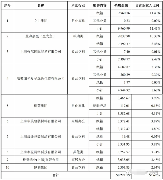 (龍利得近三年的主要財務數據和財務指標) 在客戶方面,龍利得主要為食品飲料、日化家化、糧油、家居辦公、電子器械、醫藥醫療等行業的客戶提供包裝產品和服務,可根據客戶的需求量身定制、設計綜合包裝方案。在2019年,龍利得前十大客戶包括立白、益海嘉里(金龍魚)、欖菊、伊利等知名終端企業。 2019年的前十大客戶為龍利得貢獻了5.02億元營收,占總營收的57.62%。值得一提的是,在這10家客戶中,還有部分包裝企業。這或許是因為部分紙箱企業需采購龍利得的紙板產品用于生產紙箱。同時,還有部分企業采購龍利得生產的紙箱直接對外出售。