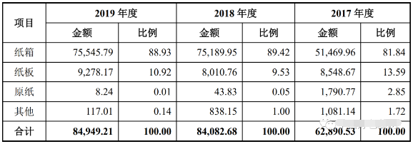 (龍利得2019年前十大客戶情況單位:萬元) 2019年主營業務收入達8.49億 近三年來,龍利得主營業務收入整體呈現出上升趨勢,2017-2019年分別為6.29億元、8.41億元、8.49億元。在產品結構上,紙箱業務的營收占比在80%以上,且正在逐步上升,紙板、原紙及其他業務占總營收的比例逐步減小。 以最近的2019年為例,在龍利得8.49億元的主營業務收入中,有7.55億元來自紙箱產品,占比達88.93%;紙板產品帶來的營收為9278.17萬元,占比10.92%。而原紙及其他產品占比較小,營收分別為8.24萬元、117.01萬元。