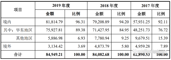 (龍利得主營業務收入構成情況單位:萬元,%) 在價格方面,龍利得的紙板、紙箱銷售單價與原紙的價格走勢基本一致。2018年,隨著原紙價格上漲,龍利得紙箱價格上升至3.45元/平方米、紙板價格上升至為3.16元/平方米;2019年,原紙市場價格有所下滑,龍利得紙箱、紙板價格分別回落至3.08元/平方米、3.03元/平方米。 目前,龍利得國內銷售主要集中在華東地區,2019年產生的營收為7.59億元,而其余地區產生的營收為則5886.98萬元。此外,龍利得境外銷售為3134.42萬元,主要為美國、澳大利亞、加拿大等國家及地區。