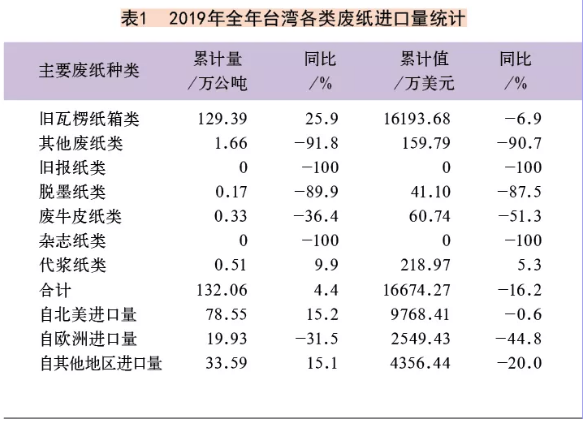 據2020年4月30日臺灣出版的《紙業新聞》報道,2019年全年臺灣進口廢紙總量達132萬余公噸,不僅較上年增長,且創下近23年來的新高紀錄。統計如表1。