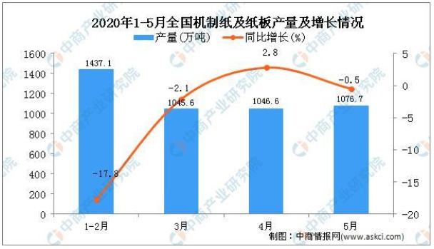 根據中國輕工業信息中心數據顯示,2020年1-5月,全國機制紙及紙板產量4636.2萬噸,同比下降6.8%。5月當月,全國機制紙及紙板產量1076.7萬噸,同比下降0.5%。