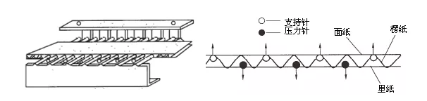 試驗時,先將被測試樣裝入附件,將帶有兩排金屬棒的針形附件插入試樣的面紙與芯紙之間,并對好支撐柱,注意不要破壞試樣,如下圖所示。然后將其放在壓縮儀下壓板的中心位置。開動壓縮儀,以(12.5±2.5)mm/min的速度對裝有試樣的附件施壓,直到楞峰和面紙(或里/中紙)分離為止。記錄顯示的最大力,精確至1N。在下圖中的右圖所示的分離是楞紙與里紙的分離,共插入了7根針,有效分離了6根楞。