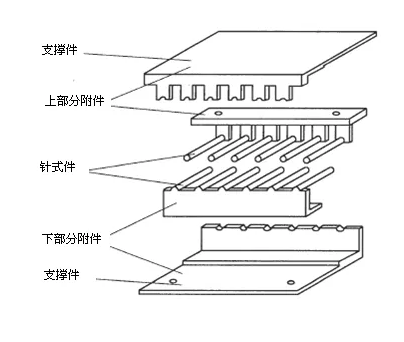 施加的拉力是通過插入瓦楞的上下兩組插棒產生的,故本實驗又稱為插針膠合強度試驗。所用儀器為壓縮強度測定儀,儀器應符合GB/T6546規定的壓縮強度測定儀的技術要求。取樣的裝置應符合GB/T6546規定的切刀和要求。附件是由上部分附件和下部分附件組成,是對試樣各粘著部分施加均勻壓力的裝置。每部分附件由等距插入瓦楞紙板空間中心的針式件和支撐件組成,針式件和支撐件的平行度偏差應小于1%。附件組成如下圖所示。