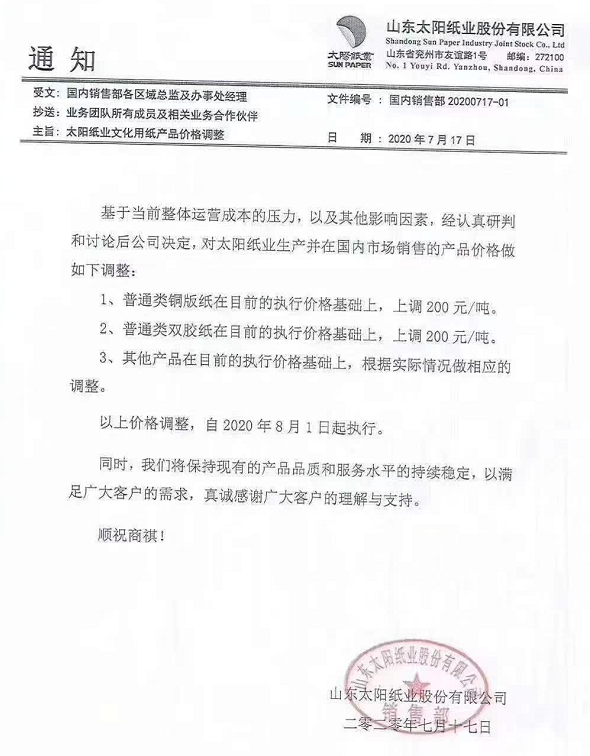 基于當前整體運營成本的壓力,以及企業影響因素,經認真研判和討論后公司決定,對太陽紙業生產并在國內市場銷售的產品價格做如下調整: