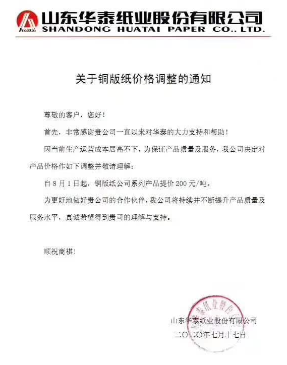 自8月1日起,銅版紙公司系列產品提價200元/噸。