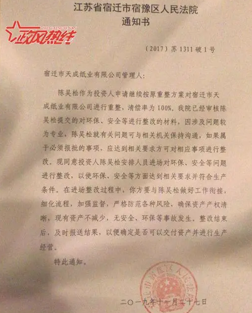 一面說企業存在問題不能復工,一面又不給企業提出具體問題整改清單。申請企業復工5個月后,6月28日宿遷生態化工園給出了書面回復:天成紙業不具備開機生產條件。原因有三:企業存在安全隱患;企業存在環保風險;重組失敗企業不具備生產條件。 3、企業莫名遭遇“被破產” 對于宿遷生態化工園管委會這個回復,宿遷天成紙業一一給出了回應。 關于存在安全隱患問題。陳吳松說,管委會說法與事實不符。他介紹,宿遷天成紙業于2019年11月28日進場開展檢修,設備均已檢修,線路、電器、儀表燈均已檢修更換完畢,并非長期停用,無維護保養。宿豫區人民法院于2019年11月27日通知宿遷市天成紙業有限公司投資人可以進場開展檢修,企業于2019年11月28日進場開展檢修,進場第一時間向管委會及安監環保部門書面匯報。2019年12月至2020年2月管委會安監環保部門多次到場檢查,檢查結果均為合格,不存在所謂的安全隱患問題。 關于環保風險問題。陳吳松介紹,企業污水處理系統恢復運行;污水排口安裝在線監測設備;生產工藝已進行改進,不存在惡臭氣味;生產過程中產生固廢也可規范化處理;環保設施安全評價可在企業試生產后開展,目前停產期間無法開展。環保檢查中,僅提出將廠內一廢棄放射源及時處理,企業已于2020年1月16日將廢棄放射源送至江蘇省核與輻射安全監督管理中心合規處理,不存在所謂的環保風險。
