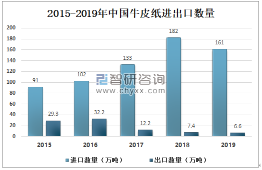 數據來源:智研咨詢整理 現在很多包裝材料都是使用牛皮紙,牛皮紙成為了商業包裝的必需品。我國進口牛皮紙數量遠大于出口,2019年中國牛皮紙進口數量為161萬噸,出口數量僅6.6萬噸。 2015-2019年中國牛皮紙進出口數量