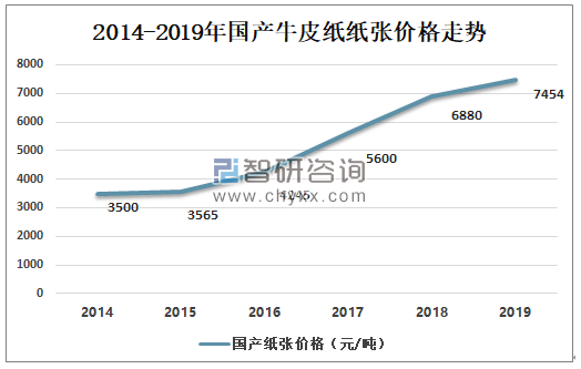 數據來源:智研咨詢整理 數據顯示:牛皮紙紙張價格逐年上漲,2014-2019年國產牛皮紙價格平均增速為16.8%。 2014-2019年國產牛皮紙紙張價格走勢