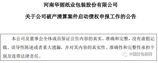 啟動(dòng)債權(quán)申報(bào)登記及審查工作 據(jù)公告顯示,華麗包裝未能履行強(qiáng)制執(zhí)行文書(shū)確定的還款義務(wù),經(jīng)強(qiáng)制執(zhí)行程序查證后,不能清償?shù)狡趥鶆?wù),且明顯缺乏清償能力,具備破產(chǎn)原因。2020年2月25日,經(jīng)華麗包裝申請(qǐng),許昌市魏都區(qū)人民法院將華麗包裝移送至許昌市中級(jí)人民法院進(jìn)行破產(chǎn)審查。 3月24日,許昌市中級(jí)人民法院作出(2020)豫10民破2號(hào)民事裁定書(shū),裁定受理華麗包裝破產(chǎn)清算一案。4月20日,許昌市中級(jí)人民法院作出(2020)豫10民破2-1號(hào)民事裁定書(shū),指定許昌市魏都區(qū)人民法院審理該案。 7月20日,許昌市魏都區(qū)人民法院作出(2020)豫1002破9號(hào)決定書(shū),指定河南君志合律師事務(wù)所擔(dān)任管理人。8月11日,許昌市魏都區(qū)人民法院將該起案件公告于全國(guó)企業(yè)破產(chǎn)重整案件信息網(wǎng)。隨后,管理人正式啟動(dòng)了債權(quán)申報(bào)登記及審查工作。 根據(jù)相關(guān)要求,債權(quán)人應(yīng)自10月15日之前向華麗包裝管理人(通訊地址:河南省許昌市八一路東段鈞鼎銀座 A 座 704 辦公室)申報(bào)債權(quán),書(shū)面說(shuō)明債權(quán)數(shù)額、有無(wú)財(cái)產(chǎn)擔(dān)保及是否屬于連帶債權(quán),并提供相關(guān)證據(jù)材料。 曾是河南包裝行業(yè)知名企業(yè) 據(jù)了解,華麗包裝起源于1964年,于1998年改制成民營(yíng)企業(yè),并于2014年成功掛牌新三板,是一家集紙板、紙箱及彩印等產(chǎn)品為一體的大型綜合包裝企業(yè)。巔峰時(shí)期曾擁有多家子公司,分布于天津、甘肅、新疆、湖北等地。 但在近幾年,華麗包裝的發(fā)展?fàn)顩r不如人意。據(jù)統(tǒng)計(jì),華麗包裝2018年度合并財(cái)務(wù)報(bào)表及母公司財(cái)務(wù)報(bào)表凈虧損分別為7729.05萬(wàn)元、5046.90萬(wàn)元,2019年上半年合并財(cái)務(wù)報(bào)表及母公司財(cái)務(wù)報(bào)表凈虧損分別為3569.50萬(wàn)元、2753.19萬(wàn)元。 步入2020年,華麗包裝接連遇上借款逾期、銀行賬戶資金被凍結(jié)、土地被法院裁定查封、公司停產(chǎn)等負(fù)面事項(xiàng),讓業(yè)內(nèi)人士唏噓一片。如今步入正式破產(chǎn)清算階段,這也標(biāo)志著,這座昔日的河南知名包裝企業(yè)即將走上終點(diǎn)。